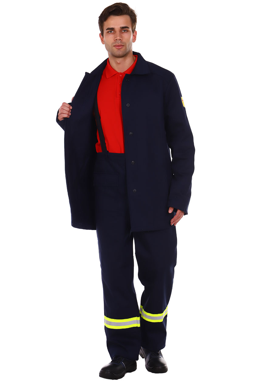 ➠ Брюки с притачным поясом, застежка гульфика на пуговицы. На правой передней половинке – накладной карман с клапаном. Передние половинки с усилительными накладками от линии бедра до низа с заходом на боковые швы. Брюки с бретелями. Нитки и фурнитура огнестойкие. По низу брюк расположен СОП 50 мм, огнестойкий.